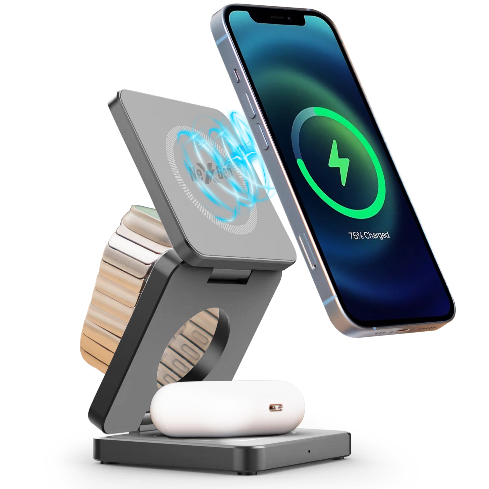 Ben je op zoek naar een centraal oplaadpunt voor al je Apple apparaten? Wil je je iPhone, Apple Watch en AirPods tegelijk kunnen opladen? Dan is deze NexGen 3-in-1 draadloze oplader de perfecte oplossing! Met deze oplader hoef je nooit meer te zoeken naar losse oplaadkabels voor je apparaten.
